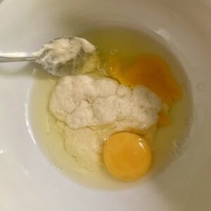 - ボウルに捨て種と油、卵を入れて、泡だて器でよく混ぜ合わせます。