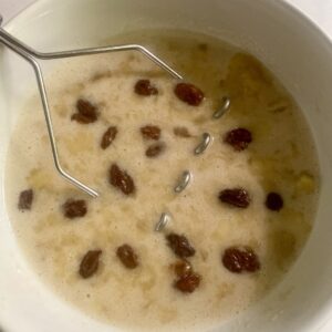 ここでレシピ外ですが、レーズン酵母を作った時のレーズンのカスがあったので入れました。味も風味も殆ど出てしまっていますが勿体ない精神で。
