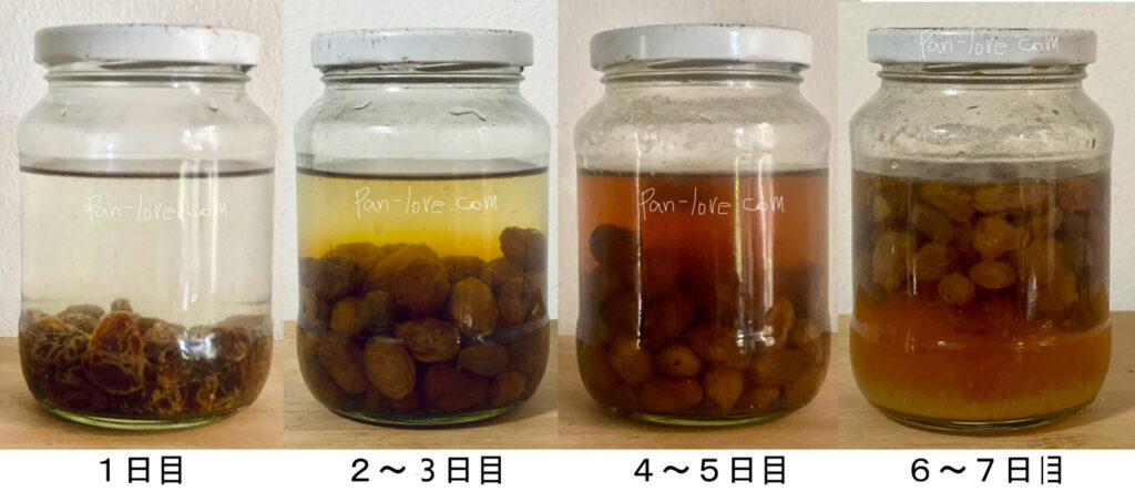 まだレーズンはそこに沈んでいますが水が色を付けてきました。
